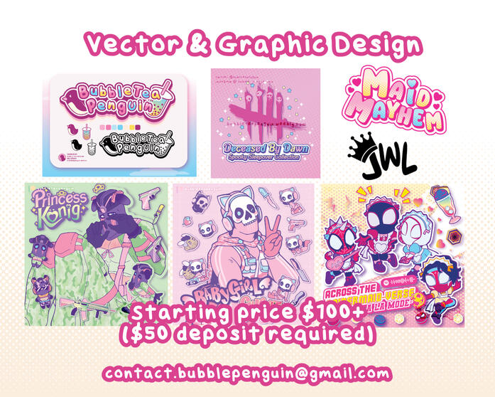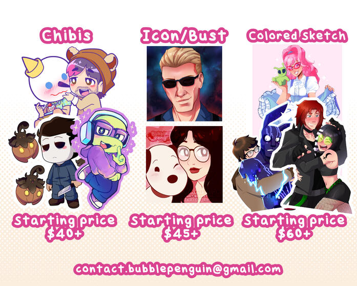 Please keep ideas within boundaries I am showcasing. I will not do any comics pages, realistic backgrounds/scenery, family portraits (feel free to email me about what I can/cannot draw)