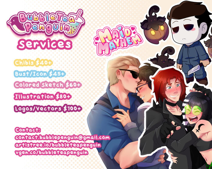 I take commissions on Artistree and Vgen (both platforms are made to take commission work in one place)